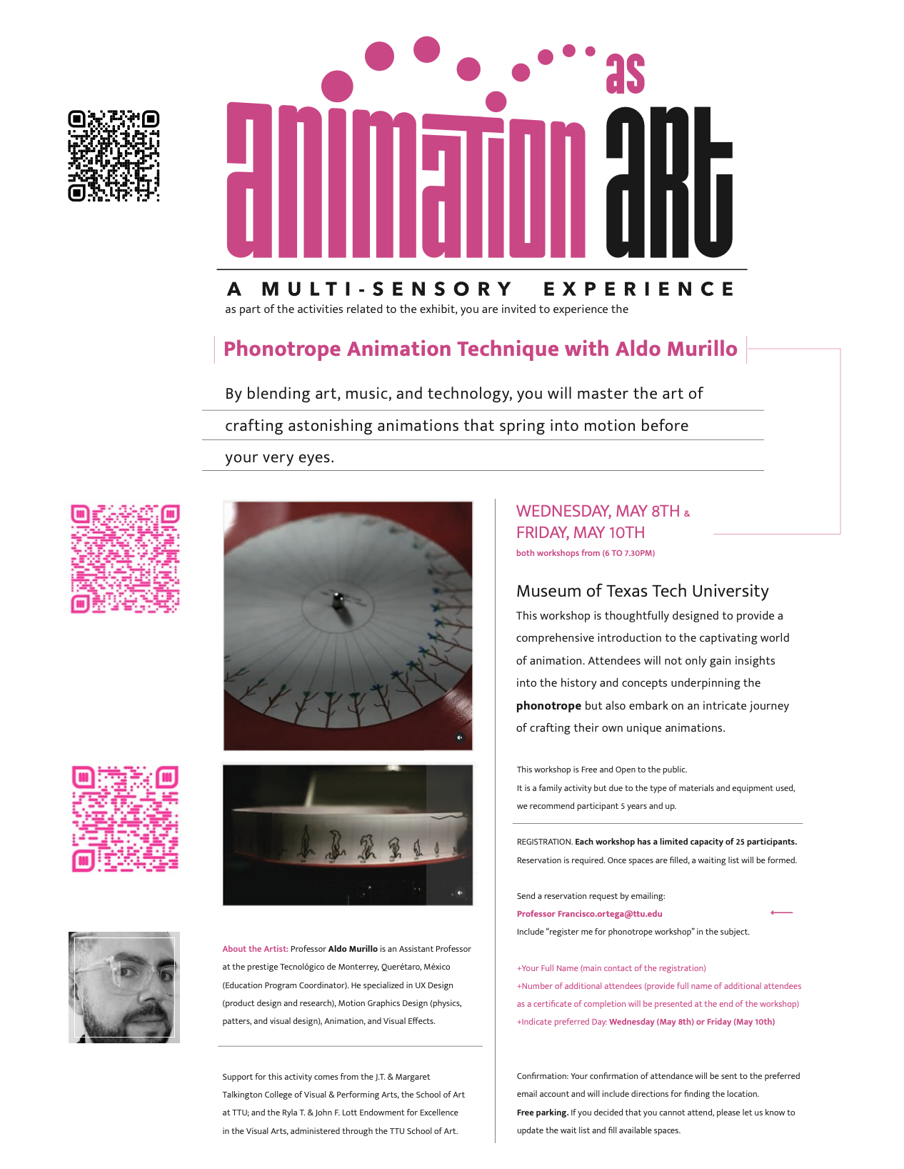 In May 2024, I led a two-session phonotrope animation workshop at the Texas Tech University Museum in Lubbock, TX. Participants — from kids to senior adults — created their own short animations using the phonotrope technique: frame-by-frame animation that comes to life on a rotating surface under a synchronized strobe light or camera shutter.